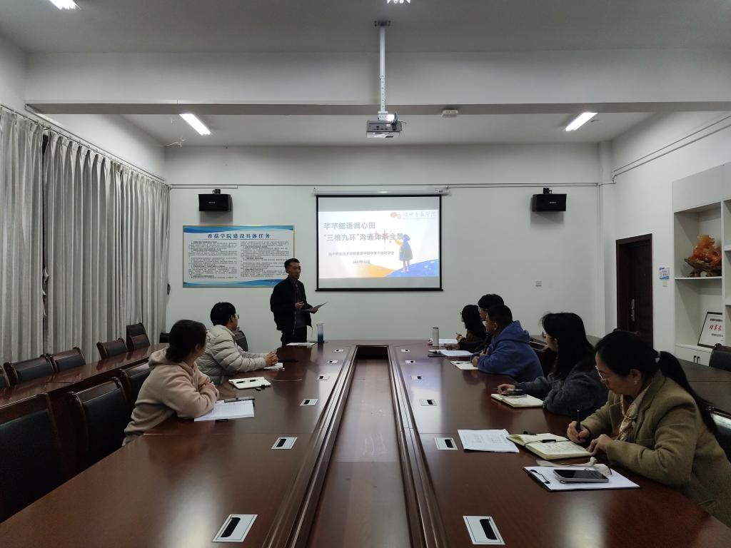 为全面提升辅导员队伍的学生沟通与思想政治教育工作水平,构建和谐融洽的师生关系,2025年11月23日晚,随州职业技术学院香菇学院学生工作办公室面向全体专兼职辅导员,成功举办了一场主题为“芊芊细语润心田,‘三维九环’沟通体系全景”的专题培训讲座。本次讲座由学院学生工作办公室主任刘剑砺担任主讲。