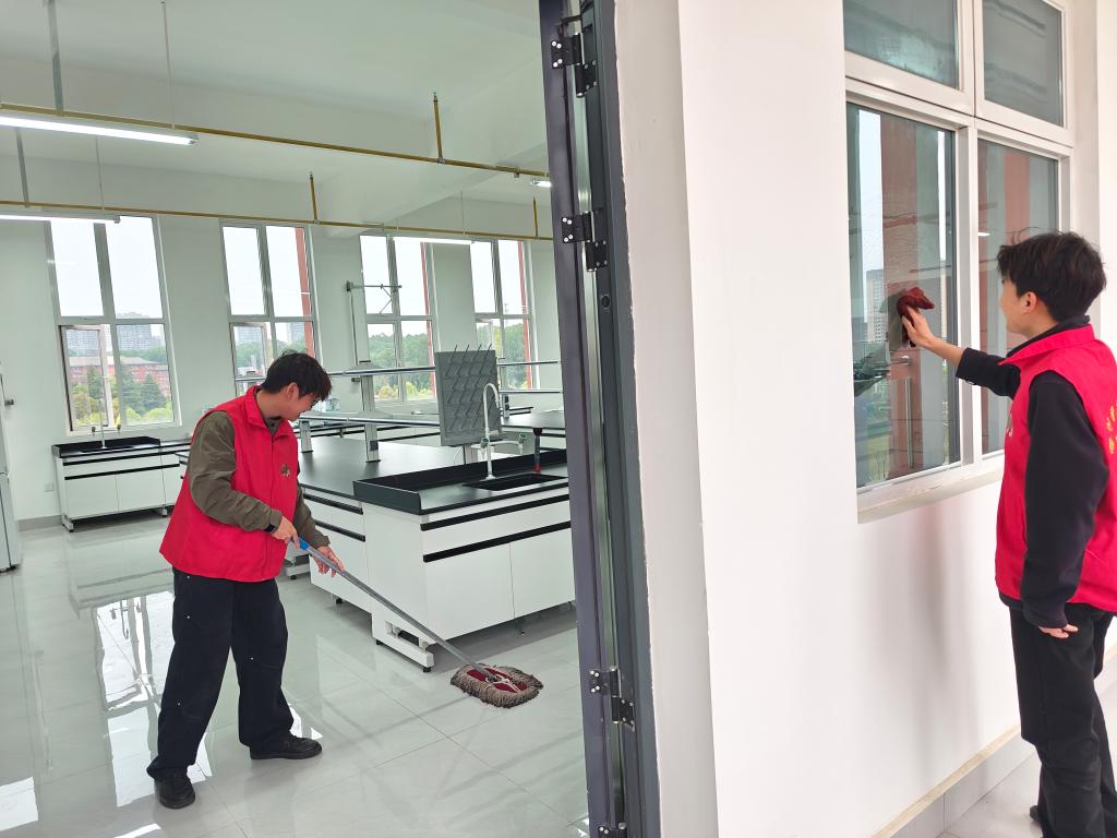 针对实训室的特殊性,志愿者们与青马学员精准发力、细致清扫。大家分工协作,有的弯腰清扫地面灰尘、捡拾杂物,有的用抹布仔细擦拭实训台、仪器设备表面,有的专注清理墙角、桌底、设备缝隙等易被忽视的卫生死角,还有的对实训工具进行规范归置,排查潜在安全隐患。过程中,大家不怕脏、不怕累,不放过任何一处污渍、任何一个角落,用双手一点点改善实训室环境,用实干诠释青年责任,成为兴业楼里一道亮丽的青春风景线。